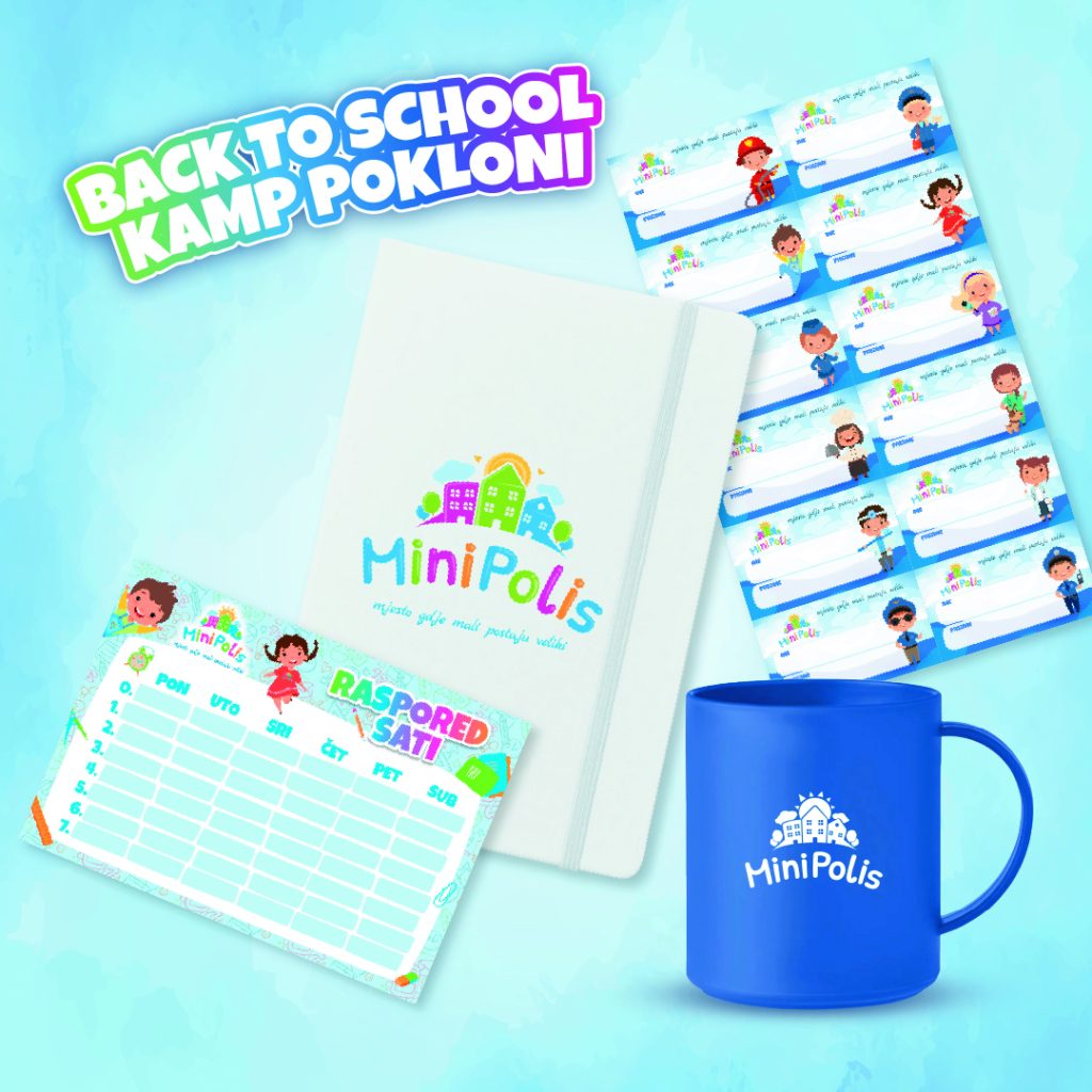 MiniPolis čarapice, raspored sati, školski set (bilježnica, naljepnice, olovka, gumica, šiljilo) i diploma kao uspomena.